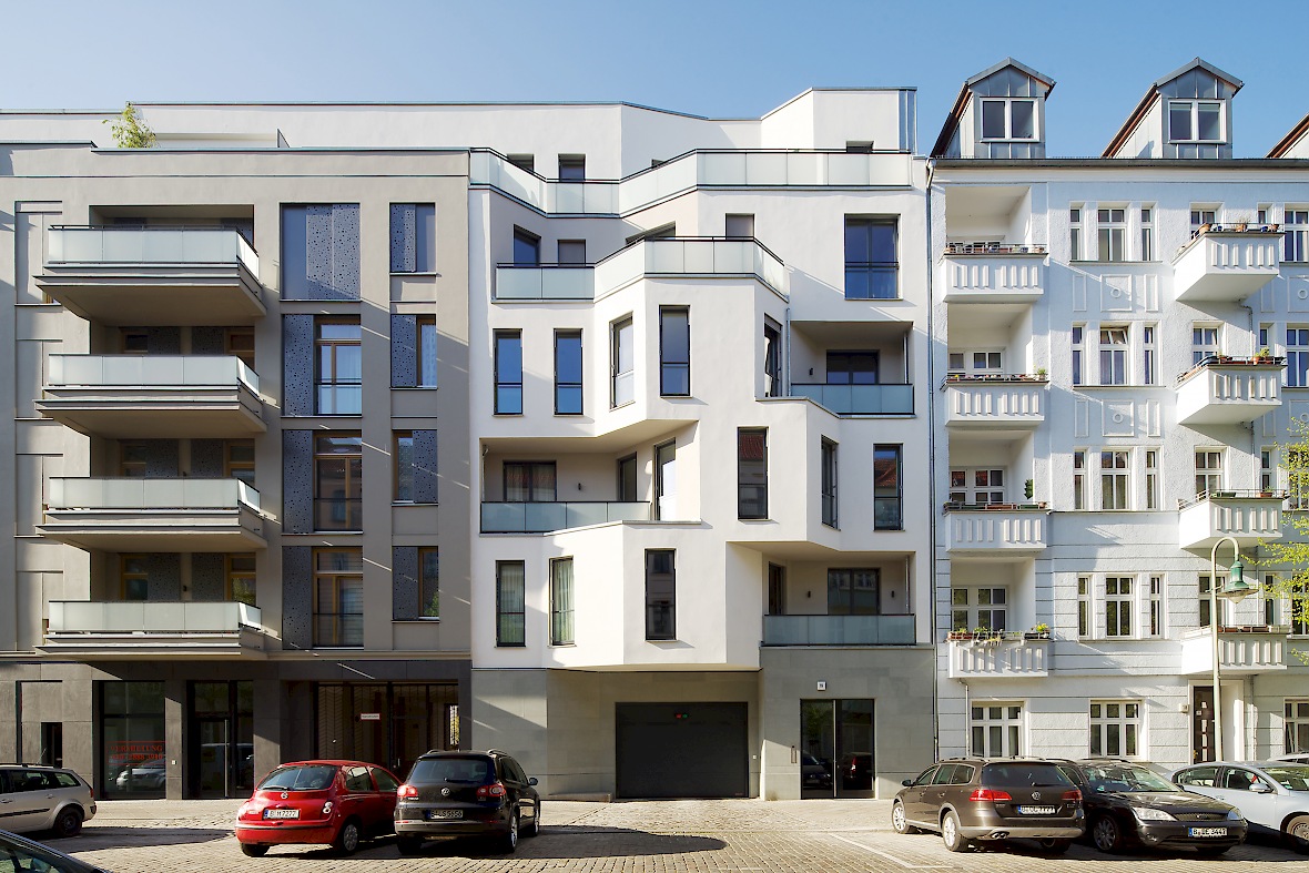 Neubau eines mehrteiligen Wohnungsblocks mit 40 Wohneinheiten in der Dolziger Straße, Berlin-Friedrichshain.
