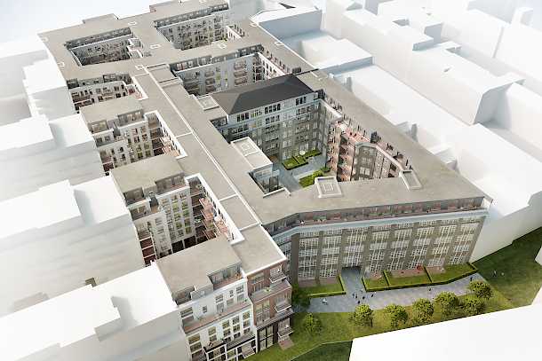 Die Herausforderung besteht darin, das Industriedenkmal im Blockinneren wieder zum Leben zu erwecken und in einem Neubaukonzept bezahlbaren Wohnraum für ein breites Spektrum unterschiedlicher Nutzungsansprüche zu schaffen.