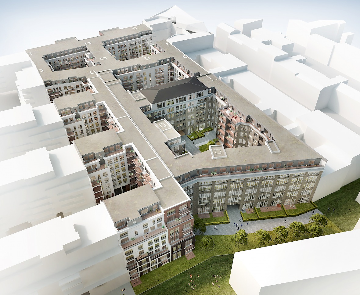 Die Herausforderung besteht darin, das Industriedenkmal im Blockinneren wieder zum Leben zu erwecken und in einem Neubaukonzept bezahlbaren Wohnraum für ein breites Spektrum unterschiedlicher Nutzungsansprüche zu schaffen.