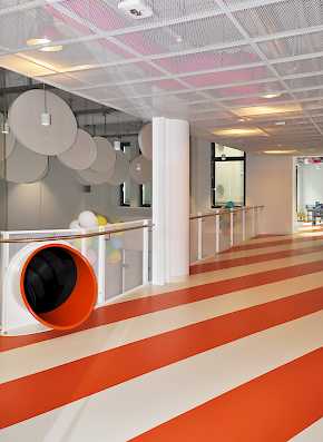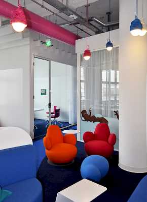 Das Ergebnis sind nach Teams organisierte Großraumbüros mit farbenfrohen Spiel-und Gemeinschaftsflächen, gegliedert durch eingeschobene Glaskuben als Meeting- und Telefonboxen.