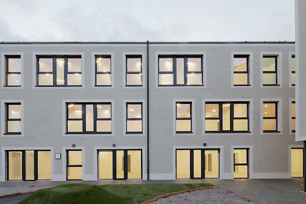 Ein Mittelbau markiert die Eingangssituation und verbindet die beiden im 90-Grad-Winkel zueinanderstehenden Gebäudeteile zu der L-Form, die zur Abschirmung des Lärmpegels für die sensiblen Bereiche, wie Schlaf- und Gruppenräume erforderlich war.