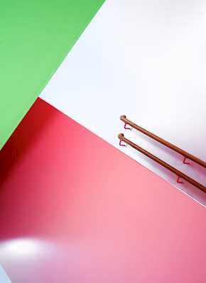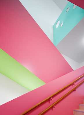 Die etagenweise Aufteilung spiegelt sich im Farbkonzept anhand farblicher Eyecatcher wider. Aus der Flurachse zurückspringende Garderobennischen sowie die Sanitärräume werden in der jeweiligen Etagenfarbe akzentuiert. Die Farbgestaltung der Treppenräume macht den Übergang zwischen den einzelnen Farben durch einen Farbverlauf an den Absturzsicherungen erkenntlich.
