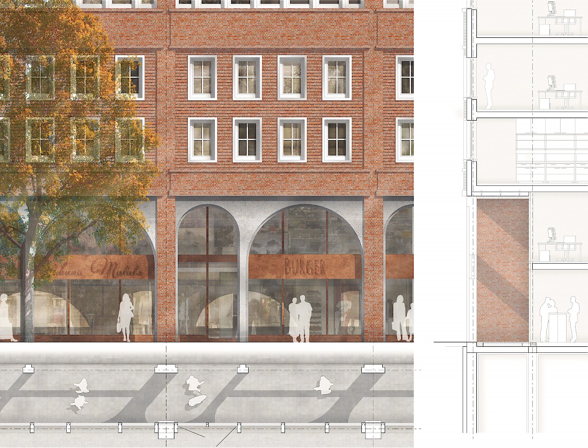 Der Sockel des Gebäudes wird umlaufend ausgebildet und unterstreicht den neuen Leitfaden des Gebäudes. Ziel dabei ist, das Gebäude trotz wechselnder Fensterformate und Geschosshöhen, zusammenzufassen und den Stadtbaustein in seiner Homogenität zu stärken. Um die Wirkung der Ladenzeile zu unterstreichen, erhält der Entwurf einen modernen Arkardengang, der durch seine Trichterwirkung die Besucher in seinen Bann zieht. Neben dem Vorteil des Wetterschutzes, bildet er einen Zwischenbereich aus, der die Wirkung der nach Innen-Gerichteten-Fassaden verstärkt.