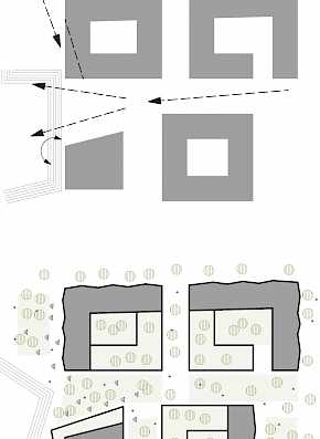 Das räumliche Konzept sieht für die Wohnhäuser eine Anordnung der Schlafräume zu den jeweiligen Innenhöfen der Bauteile vor, um eine starke Lärmbelästigung von der nördlich liegenden Straße in den Nachtstunden zu vermeiden. Neben der Anordnung der Räume sorgen eingeschnittene Loggien an der Straßenseite für die Möglichkeit der seitlichen Belüftung und reduzieren den Schall nochmals deutlich. Eine Schrägstellung der Außenwände sorgt an den quartiersabgewandten Seiten dafür, dass sich der Schall in den Straßen nicht hochpegelt, wie es bei parallel verlaufenden Fassaden der Fall wäre. Durch die schrägen Außenwände löst sich zudem die flächige Struktur der großen Baukörper auf und es entsteht ein Bild von Reihenhäusern. Dadurch zeichnen sich die einzelnen Hauseingänge stärker ab und eine Adressbildung nach außen hin wird ersichtlicher. Die äußeren Fassaden finden ihren Abschluss in einzelnen Satteldächern und zitieren damit die Architektur der Arbeiterviertel in Hamburg und Harburg.