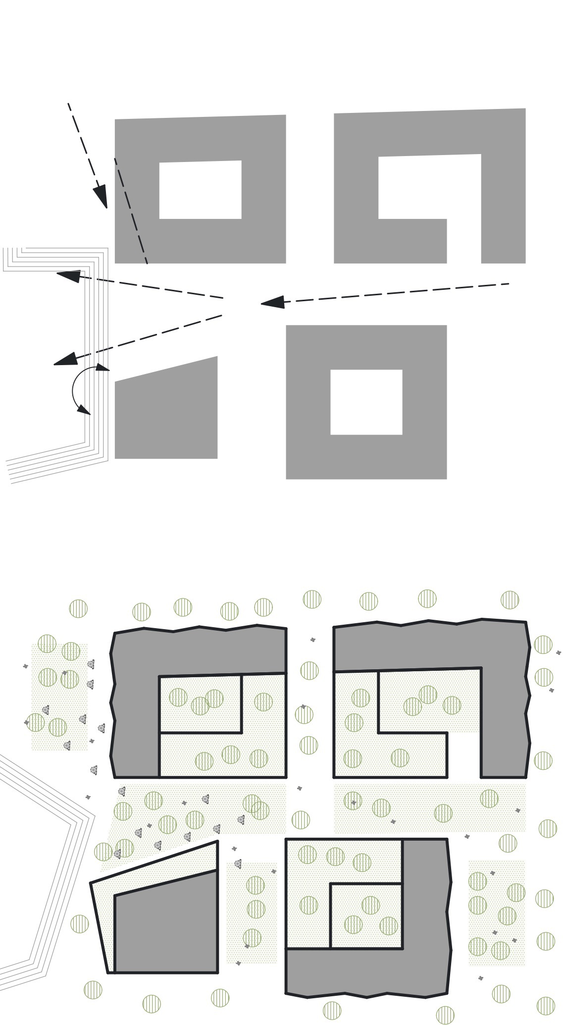 Das räumliche Konzept sieht für die Wohnhäuser eine Anordnung der Schlafräume zu den jeweiligen Innenhöfen der Bauteile vor, um eine starke Lärmbelästigung von der nördlich liegenden Straße in den Nachtstunden zu vermeiden. Neben der Anordnung der Räume sorgen eingeschnittene Loggien an der Straßenseite für die Möglichkeit der seitlichen Belüftung und reduzieren den Schall nochmals deutlich. Eine Schrägstellung der Außenwände sorgt an den quartiersabgewandten Seiten dafür, dass sich der Schall in den Straßen nicht hochpegelt, wie es bei parallel verlaufenden Fassaden der Fall wäre. Durch die schrägen Außenwände löst sich zudem die flächige Struktur der großen Baukörper auf und es entsteht ein Bild von Reihenhäusern. Dadurch zeichnen sich die einzelnen Hauseingänge stärker ab und eine Adressbildung nach außen hin wird ersichtlicher. Die äußeren Fassaden finden ihren Abschluss in einzelnen Satteldächern und zitieren damit die Architektur der Arbeiterviertel in Hamburg und Harburg.