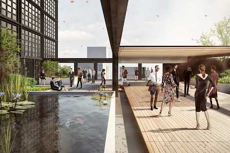 Äußere Gebäudegestaltung und Einbettung in den öffentlichen Raum unter Berücksichtigung von begrünten Flächen und Nachhaltigkeitsgesichtspunkten, Konferenzhotel und Büro in Halle an der Saale.