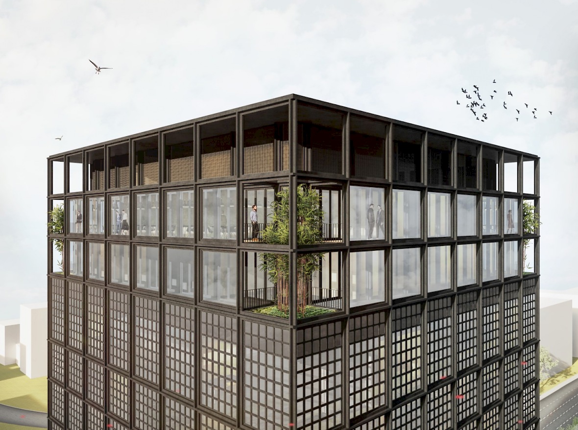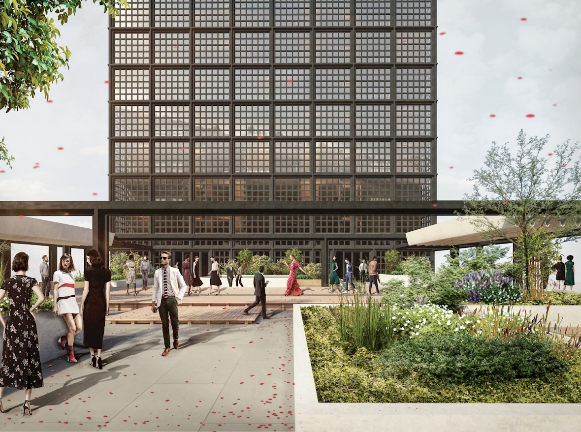 Äußere Gebäudegestaltung und Einbettung in den öffentlichen Raum unter Berücksichtigung von begrünten Flächen und Nachhaltigkeitsgesichtspunkten, Konferenzhotel und Büro in Halle an der Saale.