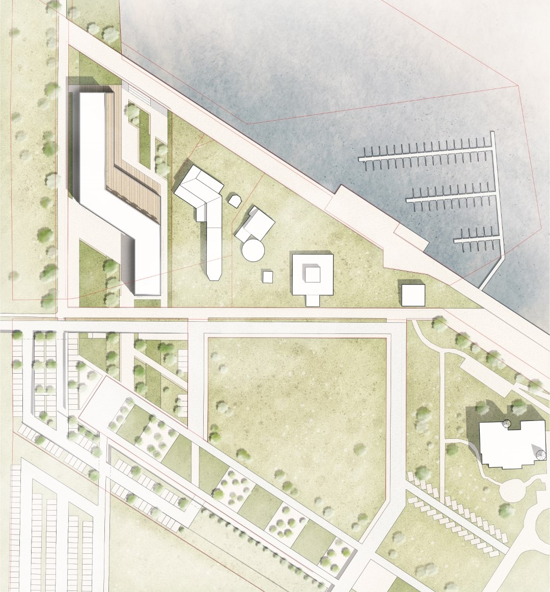 Die bestehende kleinteilige Bebauung durch Einzelbausteine wie die Bernsteinvilla, das Restaurant Seeblick“ und den Marinapark lässt das Gebiet auseinanderbrechen. Es fehlt ein eindeutiger Abschluss der Baufelder in Richtung Norden. Der Entwurf reagiert auf diese Problematik und setzt eine klare bauliche Kante zur nördlichen Bundesstraße. Der Ausgangspunkt einer durchlaufenden Kante wird durch partielles Einschieben der längsseitigen Gebäudefluchten gebrochen. Es entsteht eine S-Form. Der Mittelsteg greift die Uferkante auf und ermöglicht so die Orientierung der größtmöglichen Anzahl an Nutzungseinheiten in Richtung Wasser. Vor allem die Einheiten in den Obergeschossen können so einen 3-seitigen „Über“-Blick auf den Großen Goitzschesee genießen. Die Einzigartigkeit des Gebietes wird so optimal ausgenutzt. Die Kantenbildung zur Straße reduziert weiterhin die Lärmemission der Bundesstraße über das Planungsgebiet hinaus auf alle anderen rückwärtigen Baufelder.