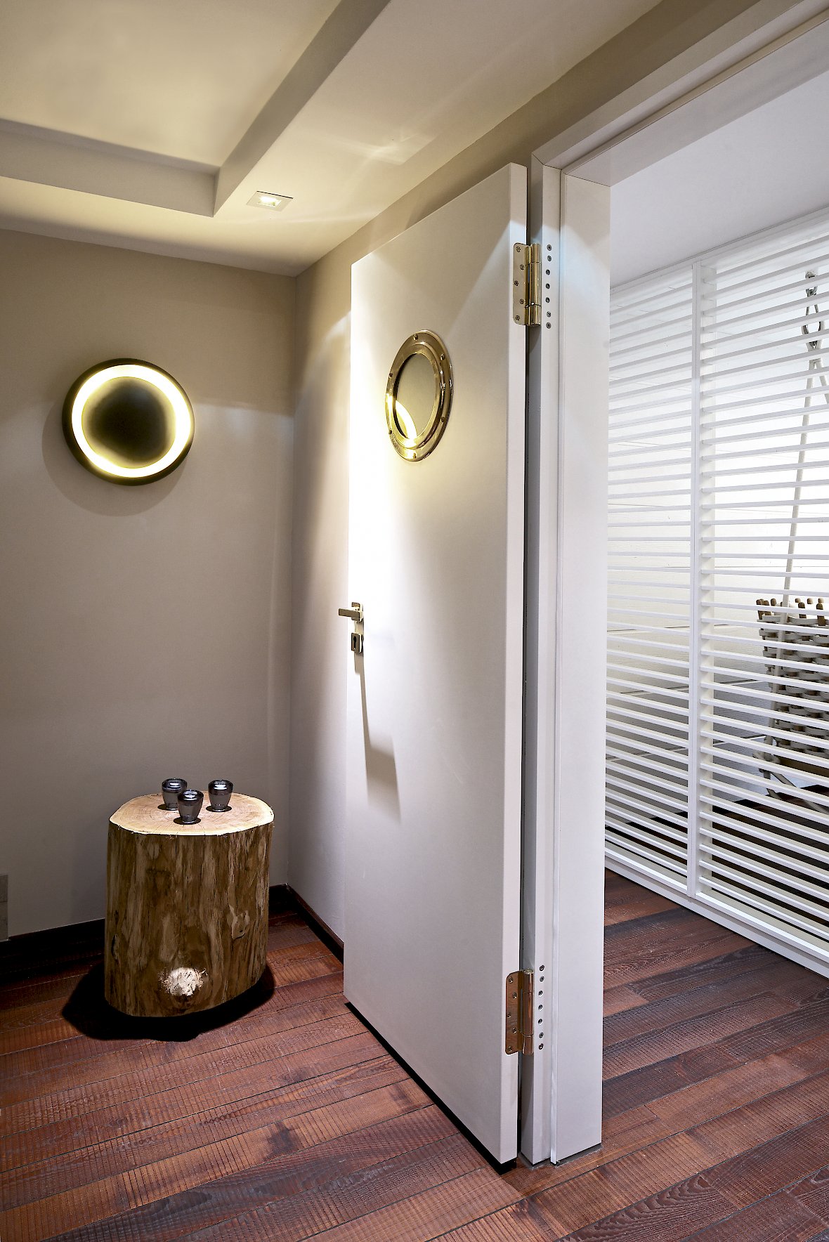 Das 4-Sterne Parkhotel in Meißen erweitert sein Serviceangebot um einen SPA Bereich. Die Herausforderung bestand darin, trotz räumlicher Begrenzung ein Konzept zu finden, welches den Besucher in die Welt der Entspannung entführt und die Einzigartigkeit des Ortes – den Ausblick auf die Albrechtsburg – inszeniert. Hierfür wurde der „Verduta“-SPA in drei Bereiche eingeteilt: Der Empfang und die Behandlungsräume erinnern mit ihrem dunklen Schiffsdielenboden und Messingbullaugen an die Ästhetik der Elberaddampfer. Für ein Gefühl wie Häuser am Meer mit Frische und Luftigkeit sorgen die weißen, holzverkleideten Wände, welche auch die notwendigen Einbaumöbel und Türen zusammenfassen. Alle Wellness-Behandlungsräume fokussieren außerdem mithilfe von Motivtapeten den Blick auf die Raumdecke – das Auge verweilt wie bei einem Trompe-l’oeil. Der dunkel gehaltene Sauna-Bereich hingegen stellt die rauen Naturelemente in den Mittelpunkt: Hitze, Dampf, Wasser und Eis. Die Wärme der finnischen Sauna aus Altholz trifft dabei auf die Kühle des Eises und des schroff gespaltenen Quarzits. Ruhe und Privatheit bieten die Kojen aus gewaschenem Rohleinen mit einem unverwechselbaren Ausblick auf die Elbe und die Burg.